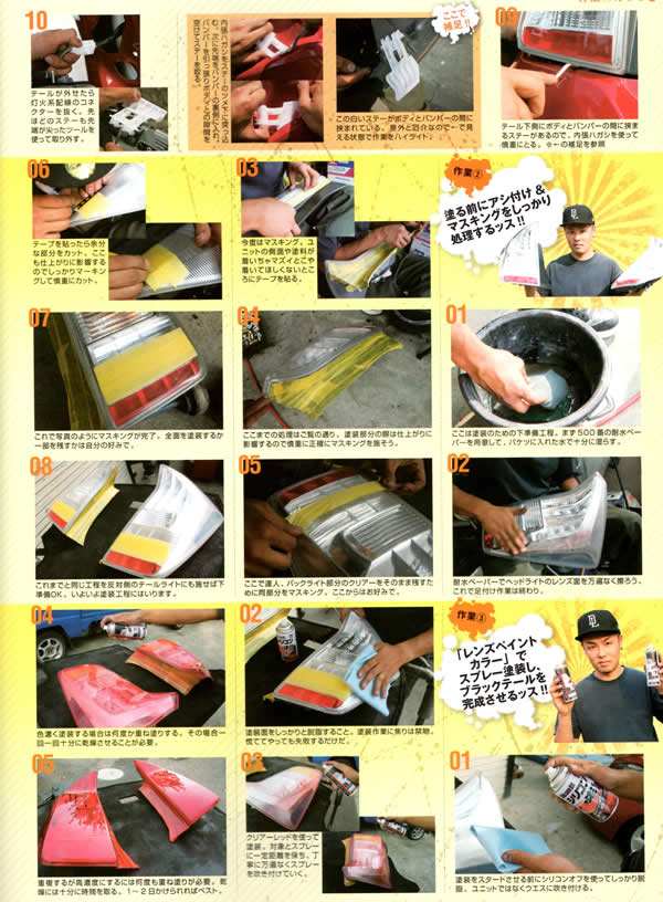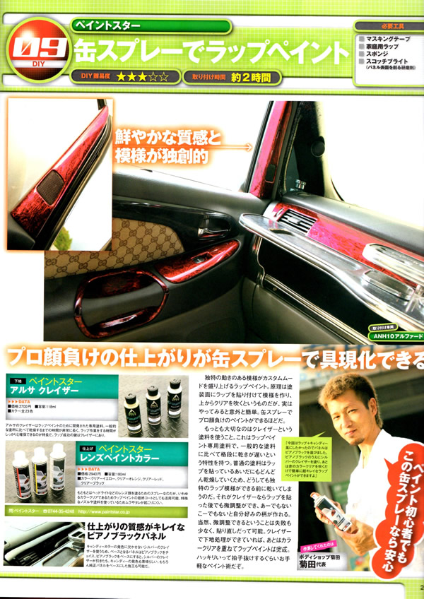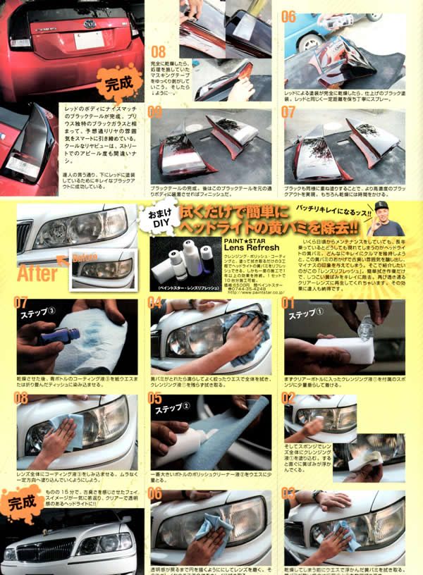 | 「缶スプレーでラップペイント」ボディショップ菊田 代表の菊田氏による作業やDIYでライトの黄ばみ汚れを落とすレンズリフレッシュの紹介など。 |