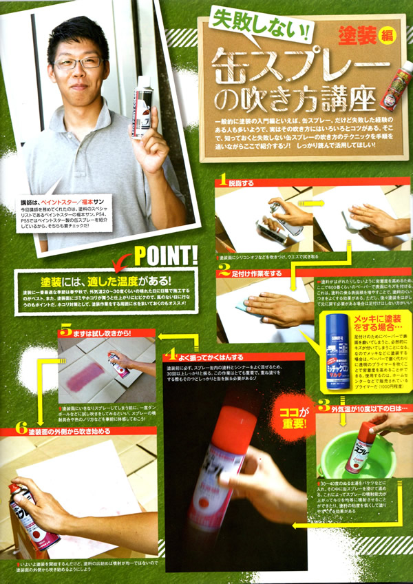 | 「失敗しない缶スプレーの吹き方講座−塗装編」にて弊社 福本によりますレクチャーが掲載されました。 |