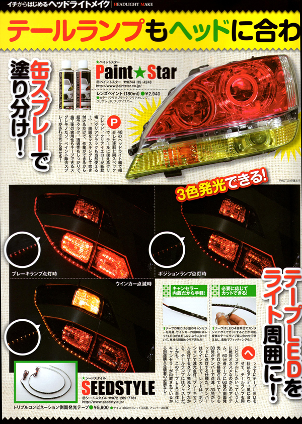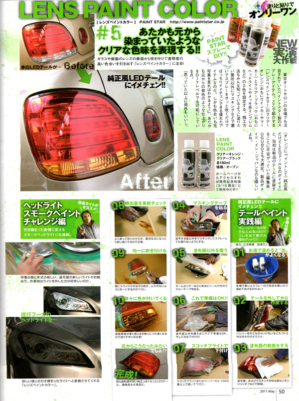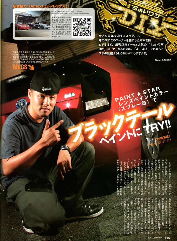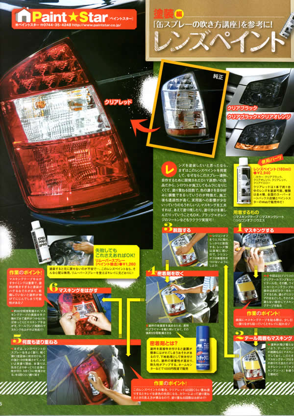 | Jラグ 5周年記念 ちょいワザDIYにペイントスター レンズペイントカラーを使用してのテールライトのブラックアウト化作業が掲載されました。 |