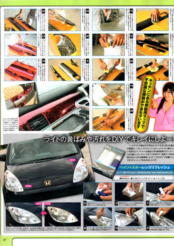 | 「缶スプレーでラップペイント」ボディショップ菊田 代表の菊田氏による作業やDIYでライトの黄ばみ汚れを落とすレンズリフレッシュの紹介など。 |